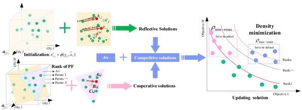 高效降维方法是水库调度的理论支撑。为此,针对单目标调度问题,团队提出了梯级水库群调度响应面逐步优化方法,运用人工智能方法构建表征水库非线性动力特性的响应面模型,快速推求不同水位-流量组合方案对应的水库出力,避免了高频冗余计算,极大缓解了维数灾;针对多目标调度问题,以团队前期原创的合作搜索算法为基础,提出了基于分解框架的水库群调度多目标合作搜索方法(MOCSA/D),提升全局寻优及邻域探索能力,增强优质方案的引导力和竞争力,快速获得分布均匀的调度方案解集合,保障了综合效益和水资源利用率。